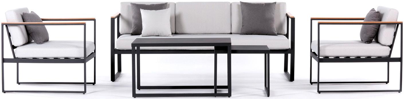 sestavljena iz troseda d 188 x š 80 x v 67 cm, 2 foteljev d 76 x š 80 x v 67 cm ter večje mize d 90 x š 90 x v 50 cm in manjše mize d 50 x š 50 x v 43 cm, prašno barvano jekleno ogrodje, naslon za roke iz polywood materiala, vključno z blazinami za sedeže in naslone, brez okrasnih blazin, črna