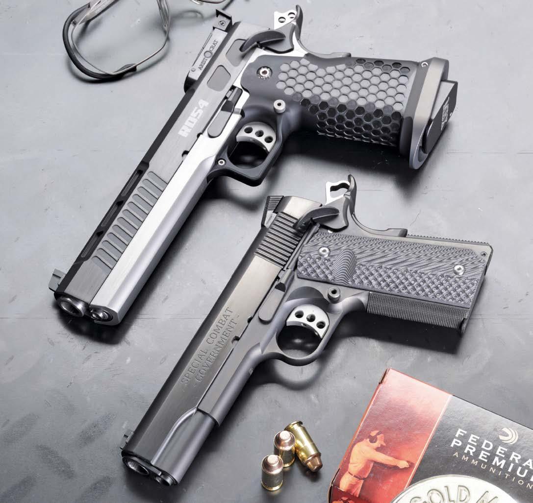 Brownings Beste: Die .45 Auto ist seit 120 Jahren ein führendes Zentralfeuerkaliber in der Pistolenwelt. Hier zwei für diese Patronen eingerichtete 1911er/2011er-Pistolenmodelle, die uns Karl Prommersberger dankenswerterweise zur Verfügung stellte. Oben die STP 2011 ROSA und darunter eine klassisch gehaltene STP Einzelanfertigung „Special Combat Government“.