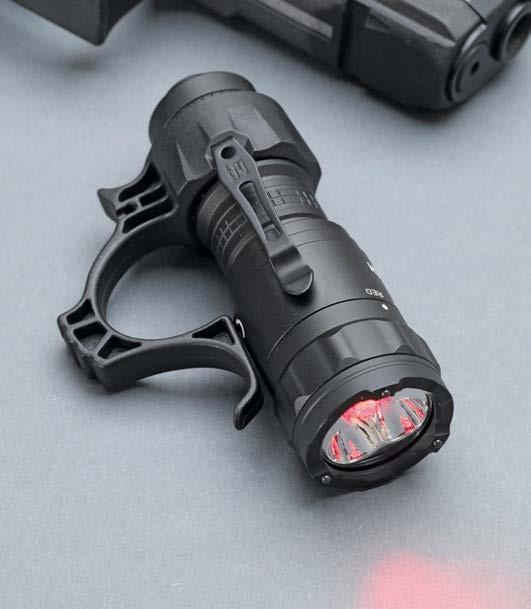 Die bewährte „Nextorch-Rezeptur“ mit den typischen Zutaten trifft man auch bei dem bis zu zwei Metern wasserdichten Gnom an: Robuster Leichtmetallkörper mit anodisierter Oberflächenvergütung, leistungsstarke Leuchtdioden mit 1300 Lumen Weiß- und 150 Lumen Rotlicht sowie Lampenkopf mit Nano-Keramik-Glasbrecher und Metalltrageclip. Das Bedienkonzept überzeugt durch seine Simplizität und schützt vor unbeabsichtigten Handhabungen – Stichwort „Lichtdisziplin“. Am drehbaren Lampenkopf mit griffiger Kontur entdeckt man die vier sauber markierten Positionen „Lock“ (verriegelt, keine Lichtaussendung), „Red“ (rote LED für IR/Rotlicht wird angesteuert), „Duty“ (die beiden Weißlicht-LED werden aktiviert) und „Tac“(weißes Momentlicht bei leicht gedrücktem und Stroboskoplicht bei voll durchgedrücktem Heckschalter). Nach der Voreinstellung am Linsenring auf „Red“ oder „Duty“ können dann mit der Drucktaste am Lampenende drei Leuchtstärken-Modi „High“, „Medium“ und „Low“ angewählt werden. Bei Rotlicht beträgt die Lichtintensität dann 150, 30 und 3 Lumen und in „Duty“ 1.300, 230 und 30 Lumen. Die Laufzeiten der aufladbaren 16340erBatterie mit USB-C-Port (oder alternativ CR123A) lauten analog zu den WeißlichtModi eine Stunde, 2,15 Stunden sowie 20 Stunden sowie in den Rotlicht-Modi 3,5 Stunden, 5,5 Stunden und 50 Stunden.
