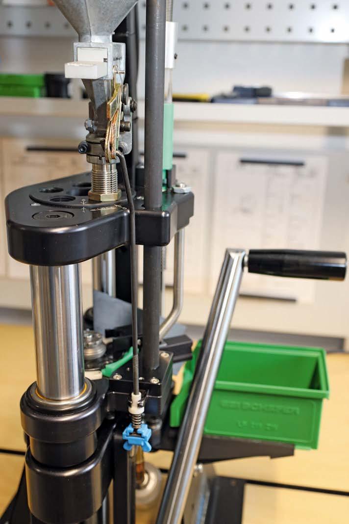 Ohne Zusatzausrüstung bringt die Turban Präzimat5 satte 18 kg Kampfgewicht auf die Waage. Ganz der Firmenphilosophie treu bleibend, besteht die neue Progressivpresse aus blitzsauber CNC-gefertigtem Stahl; Gussteile und Billigmaterialien sucht man vergebens. Als 5-Stationen-Lademaschine mit Autoindex wurde die Präzimat5 nach dem Funktionsprinzip der populären Dillon 650-/750-Pressen aufgebaut. Sie besteht aus einer mittels zwei Säulen verbundenen Fuß- und Kopfplatte. Dazwischen bewegt sich der Schlitten mit dem Pressenstempel auf einer Hublänge von 117 mm. Hinsichtlich der Stabilität, Minimaltoleranzen und mechanischer Präzision überzeugt die Mehrstationenpresse genauso wie die schon seit Jahren erfolgreich auf dem Markt eingeführte Einstationenpresse von Turban. Es können Hülsen mit einem Bodendurchmesser von 8 bis 16 mm auf der Presse bearbeitet werden. Ergo können Kaliber von .22 Hornet bis 10,3x60R auf der Presse geladen werden. Alle beweglichen Hauptfunktionsteile sind mit hochwertigen Standardindustrielagern mit Schmierstellen ausgestattet. Bei Bedarf kann man diese Ladepresse durch einen Lagertausch kostengünstig wieder in den Neuzustand versetzen, was sicherlich erst nach vielen Dienstjahren der Fall sein wird. Die vordere Säule und die hintere Säule der Präzimat5 mit einer 17,5-cm-Tischerhöhung für bequemes Arbeiten, weisen Durchmesser von satten 40 mm und 25 mm und der Pressenstempel von 35 mm auf, der Ladehebel lässt sich wahlweise rechts wie links montieren.