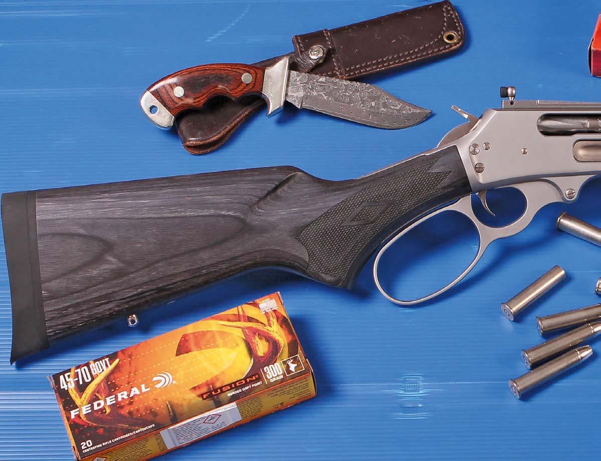 yodan im US-Bundesstaat North Carolina ansässige Marlin-Werk Gas: Das zeigen die fünf Lever-Action-Reihen SBL Series, Dark Series, Classic Series, Guide Guns Series und Trappers Series, die sich durch ihre jeweilige Ausstattung de nieren. Und diese lässt Marlin jeweils den Modellen 1895 in .45-70, 1894 in .44 Magnum und .357 Magnum sowie 336 in .3030 Winchester angedeihen. Insgesamt führte das zu 19 Varianten, mit fünf gibt es die meisten bei der Trapper Series. Eine davon kam über den Importeur AKAH in den VISIER-Test, dabei ging es auch um die Verwendungsmöglichkeiten solch einer Büchse in good old Germany.