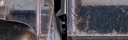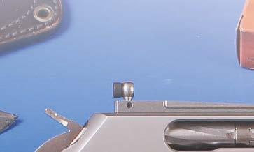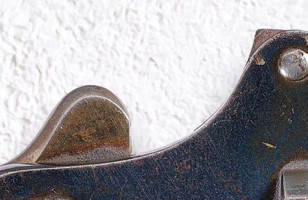 Oben links im Rahmen sitzt die Auszieherkralle des Stoßbodens, darunter der Hülsenauswerfer.Unter dem Hahn am Rahmen fi ndet sich der Ablenknocken. In der Trommel sieht man die Stiffte der Deaktivierung.