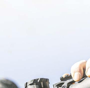 zichtet auf jegliche Art von mechanischer Visierung, wie sich etwa noch bei der AUG-Variante A3 SA „ SWAT “ ndet. Im vorderen Bereich ist die neue, einteilige 12-Uhr-Montageschiene deutlich niedriger gehalten als hinten. Das hat schon seinen Sinn, denn wenn hier bei einem kompakten Gewehr wie dem AUG Zubehör befestigt wird, dann typischerweise taktische Leuchten oder am besten gleich ein Laser-/Lichtmodul. Und die müssen nicht „ meterhoch “ über dem Handschutz thronen, wo sie eventuell auch einen negativen Ein uss auf die Montagehöhe der Zieloptiken haben können. Vielmehr sollen sie (beziehungsweise ihr Schalter) griffgünstig für die unterstützende Hand in Reichweite bleiben, ohne das Visierbild zu stören. Alle AUG A3 haben zwar auch eine kurze Picatinny-Schiene rechts oberhalb des Abzugs am Gehäuse. Das ist aber für Sturmgewehre nicht der gängigste Platz zur Befestigung von taktischen Lichtquellen.