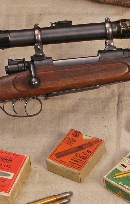 Die von Max Meffert vertriebene Jagdbüchse mit 98er System, hier mit Fernglas und zeitgenössischen Patronen in 9,3 x 62 mm.