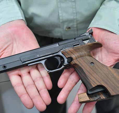 Gleich drei Ganzstahl-KK-Pistolen zeigte Walther: die abgebildete CSP (Classic Sports Pistol, € 1499,-) „Expert“ mit verstellbarem Form-Handgriff, justierbarem Matchabzug, Drehkorn und Mikrometer-Kimme. Die für IPSC kon gurierte Variante CSP Dynamic hat symmetrische Griffschalen für den beidhändigen Anschlag, sie kostet € 1399,-. Das Basismodell, die CSP Classic, hat 1911-ähnliche Griffe (€ 1299,-). Alle Modelle mit 10-Schuss-Ersatzmagazin. (www.walther.de)