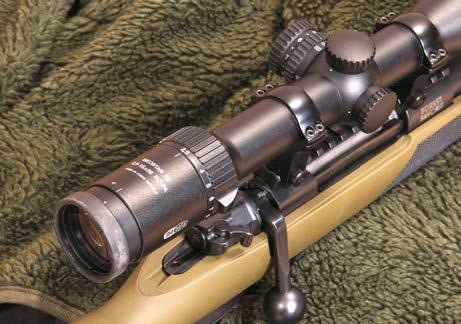 Mit der Meostar R2-Reihe bedient die Firma seit einigen Jahren das PremiumSegment zwischen „Budget“ - und „High End“ -Gläsern zur Jagd. Hochwertiges beschichtetes Linsenmaterial und stabile Mechanik bilden die Basis. Das Testmodell hat den nahezu als Standard anzusehenden Mittelrohrdurchmesser von 30 mm, es misst insgesamt 352 mm und wiegt rund 680 Gramm – das passt gut zu einer nicht allzu zierlichen Büchse. Die Ober äche des ZF-Tubus aus Aluminium ist mattschwarz harteloxiert und kratzunemp ndlich. Die Dioptrienverstellung ndet sich vor dem mit Gummischutz versehenen Okular, davor sitzt der grif ge, mit einer Nocke versehene Zoom-Ring zur Änderung der Vergrößerung. Mittig ragen die Türme zur Seitenund Höhenverstellung des Absehens auf, links nden sich Parallaxeeinstellung und Leuchtpunkt-Bedienung.