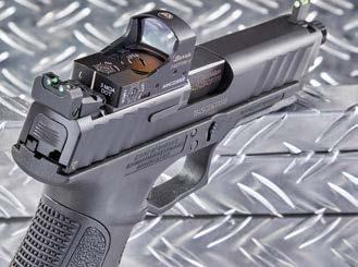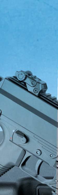 Nun gut, „ schön “ scheint anders! Die Stoeger STR-9S hat auf den ersten Blick eher eine Anmutung wie eine extrem martialische Filmwaffe. Doch im Falle der Stoeger ndet sich mehr Sein als Schein. Die prominente, sehr hohe Visierung zum Beispiel. Sieht ohne montiertes Rotpunktvisier reichlich wuchtig aus. Ist aber genau deswegen, bei Ausfall des Rotpunkts, noch immer in der Re exscheibe sichtbar.