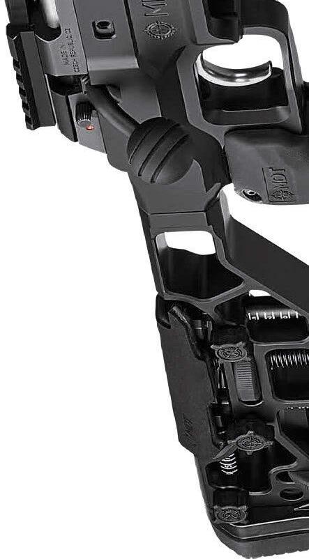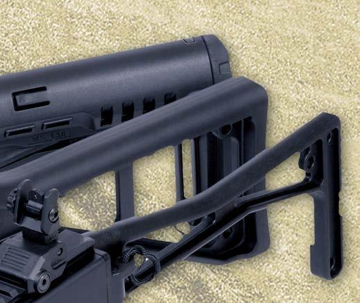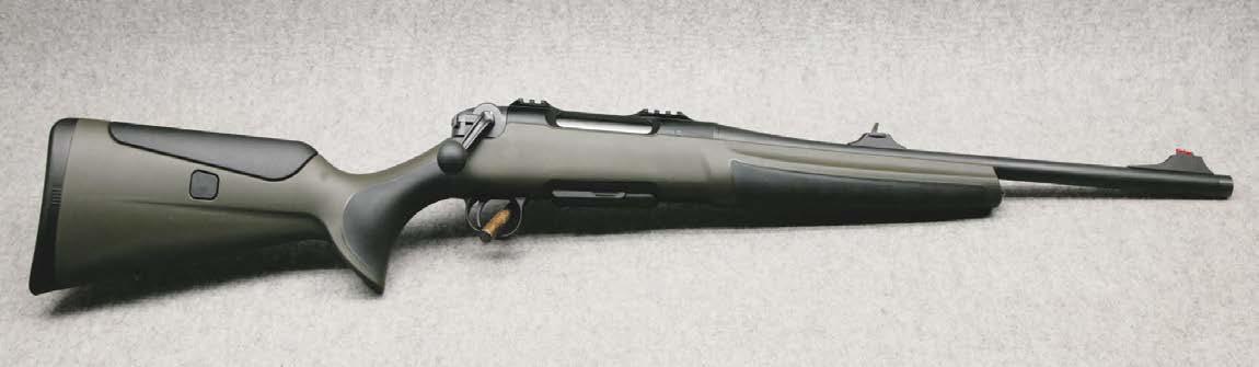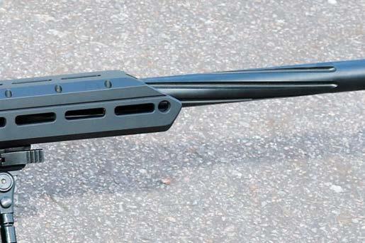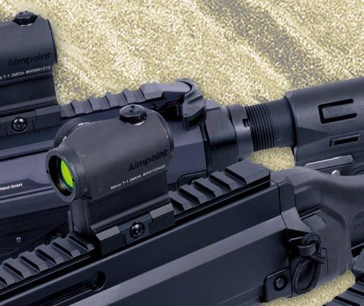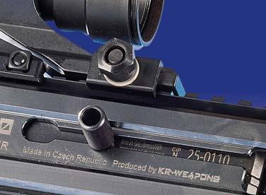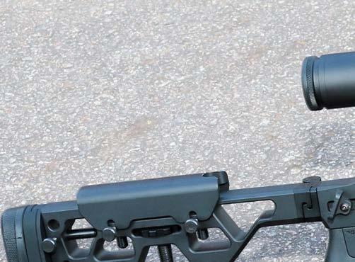 nicht im Lauf. Auf der Systemoberseite ist eine knapp 160 mm lange Weaver-Schiene mit vier Schrauben befestigt. Die Vorneigung der Schiene beträgt 20 Winkelminuten. Der Schlosshalter und die Abzugsgruppe sind mit der Systemhülse verstiftet. Der Direktabzug ist laut Hersteller zwischen 1300 bis 1500 Gramm Abzugswiderstand justierbar. Die Testwaffe hatte jedoch im Mittel einen Widerstand von für eine Sportwaffe extrem hohen 2333 Gramm. Auch kriecht der Abzug minimal, bevor er auslöst. Seitlich am Abzugsgehäuse be ndet sich die ZweiStellungs-Sicherung, die ausschließlich auf den Abzug und nicht den Schlagbolzen wirkt. Die Sicherung lässt sich nur bedienen, wenn die Schlagbolzenfeder gespannt ist. Der Verschluss samt angesetztem Kammerstengel sind aus einem Stück im Gesenk geschmiedet. Der Verschlusskopf trägt zwei Warzen in klassischer 180-Grad-Anordnung, womit sich ein Öffnungswinkel von 90 Grad ergibt. Eine Warze trägt eine durchgehende Nut, welche korrespondierend zu einer Feder im Systemgehäuse ist und als Verdrehsicherung dient.