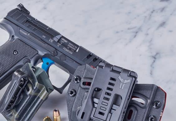 Dort hat man sich ganz auf den Werkstoff Kydex verschrieben, einem thermoplastischen PVC und heute als Kunststoff für Dinge wie Messerscheiden und Pistolenholster das Material der Wahl. Grundsätzlich unterteilt man die Holster in IWB (Inside Waist Band) und Outside Waist Band, letztere werden klassisch am Gürtel außerhalb des Hosenbundes getragen. Die Firma offeriert auch Behördenholster mit Verschluss-Systemen für die Waffe, aber die meisten Modelle verwahren Pistole oder Revolver über die Passung um den Abzugsbügel und den Ziehwiderstand – so auch die beiden vorliegenden Holster. Die Testmuster kamen passgenau geformt für eine Hugo 1911 von Schmeisser mit klassischer Fünfzoll-Lau änge sowie die Q5 Steel Frame von Walther. Obacht: Bei der Q5 SF sind Hersteller und Modell und damit auch die Holsterform völlig klar und damit unproblematisch. Anders sieht es bei 1911ern aus. Letztere fertigen eine Myriade Hersteller, sie sind in ihren äußeren Konturen je nach Firma und Ausstattung nicht alle gleich, auch nicht solche im Stil ähnlich der Hugo mit einer kurzen Picatinnyrail vor dem Abzugsbügel. Des-