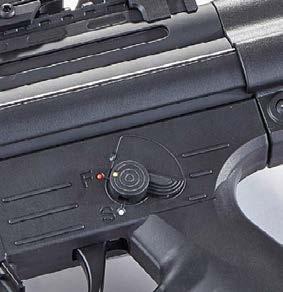 spannten Zustand gehalten. Das Durchziehen des Druckpunktabzugs löst den Schuss aus, der Schlitten geht zurück, der Schlagbolzen wird in der gespannten Stellung gefangen, der Schlitten läuft durch die Schließfeder angetrieben vor und führt dabei eine Patrone aus dem Magazin zu. Das leicht gebogene Magazin fasst sechs Patronen und ndet seinen Platz unten vor dem Abzugsbügel. Hier hält eine gefederte Klinke es an Ort und Stelle. Simpel, aber clever ist die als Schieber über dem Abzug liegende Sicherung konstruiert. Als Achse des Schiebers dient die hintere Systemschraube, im Schieber sitzt eine Feder. Sie stützt sich am Abzugszüngel ab und erzeugt einen