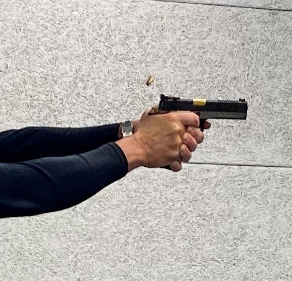 Kaum dem sehr hochwertigen Koffer entnommen, hält man die Pistole erst einmal längere Zeit andächtig in der Hand. Gut 1200 Gr amm Leergewicht – so was ndet sich heute, außer bei ausgewiesenen Sportpistolen im Kaliber 9 mm Luger, nur noch sehr selten. Und das bei einer SchlagbolzenschlossPistole, mit der typischen Sperrklinke im Abzug? Und genau dieser Abzug sorgt umgehend für die zweite Besinnungspause. Denn die Abzugscharakteristik, schon bei der polymeren Canik Mete nicht von schlechten Eltern, gleicht bei der Rival-S eher einer Sportpistole. Das Abzugszüngel anziehen, Druckpunkt nehmen – weg! Ohne Ruckeln, ohne Kratzen oder einen auch nur ansatzweise schwammigen Druckpunkt. Dazu von gefühlt unglaublich niedrigen Widerstandswerten. Nachgemessen ergaben sich dann nur knapp 1950 Gr amm Widerstand und das bei einem noch ungeölten, fabrikneuen Abzugssystem.