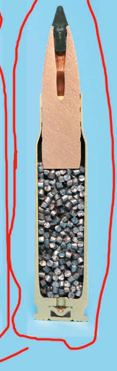 Mal richtig weit schießen? Wie weit ist eigentlich „richtig weit“ ? Tja, da wäre das hier zu nennen: 2019 und 2020 war auf der SHOT Show in Las Vegas eine fast mannslange CustomBüchse zu sehen, bestückt mit Nightforce-Glas 7 – 35 ATACR, Bix‘n Andy-Abzug, BAT 50-System, TacomHQ-Optikverstärkern (Charlie und Delta), Bartlein-Lauf mit Terminator-Mündungsbremse und McMillan ELR-Beast-Schaft. Dazu kam das Kaliber .416 Barrett, hier laboriert mit einer Charge von Vihtavuoris 20N29-Pulver, davor ein 550 GrainsGeschoss von Cutting Edge – man stelle sich ein gestrecktes Spitzprojektil vor, fast so lang wie die Hülse, deren Schulter wiederum extrem fl ach ausfällt. Das so bestückte Gewehr in einem Steilgeschütz-artigen Winkel arrangiert, ging