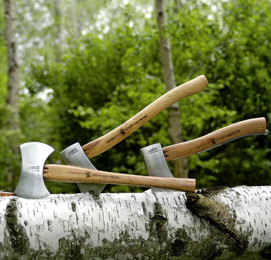 nem kurzen Stiel und relativ leichtem Kopf, so dass es zur Not auch noch an den Gürtel gehängt werden kann. Die dritte Form ist ein Tomahawk, der sehr leicht und dünn ist, aber durch den langen Stiel doch erstaunlich tief ins Holz eindringen kann.