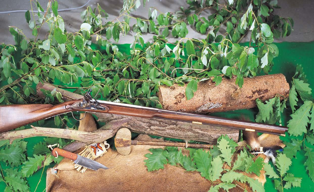 Eine Indian Trade Musket als Neo Classiker-Nachbau der italienischen Firma Pedersoli, hier im Kaliber 15,85 mm (.20“). Typisch für diese glattläufi gen Steinschloss-Vorderladerwaffen waren der große Abzugsbügel und die Gegen-Schlossplatte mit dem Motiv eines schlangen artigen Drachens.