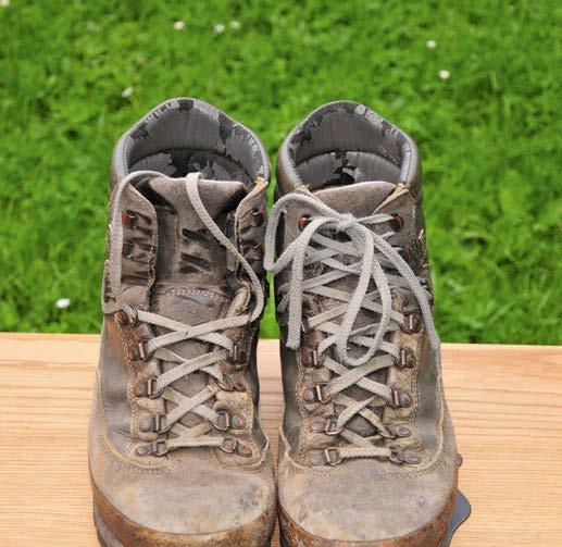 Wichtigstes Kleidungsstück für zu Fuß Reisende sind die Wanderstiefel. Da hat jeder sein Lieblingsmodell. Der eine mag Lederstiefel, der andere Exemplare aus moderneren Materialien. Generell gilt, der Stiefel muss gut sitzen und dem Fuß Halt bieten. Weiterhin soll er atmungsaktiv sein und nach Möglichkeit wasserdicht. Ungeachtet von Marke und Typ gilt für alle Varianten, dass sie jeweils richtig gep egt werden. Ein Bergstiefel muss hart sein, damit er dem ganzen Fuß Halt gewährt, wenn er auch nur mit der Spitze aufgesetzt wird. Einen Teil der Stabilität bekommt er von der Sohle, den anderen vom Oberleder. Daher ist es falsch, das Oberleder weich walken zu wollen. Lederöle sind zwar gut aufzutragen, weichen aber das Leder auf und zerstören so den guten Schuh. Besser sind stark wachshaltige Spezialprodukte, die nur in den oberen Lederschichten eine elastische Schutzschicht aufbauen und die Festigkeit des Leders