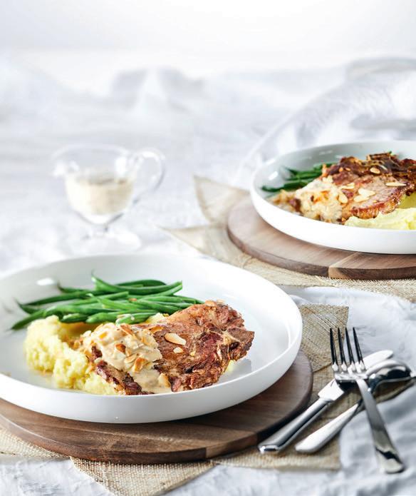 Garneer het gerecht met geroosterd amandelschaafsel. De geroosterde notensmaak is een mooie match met de lichtzoete uiensaus!