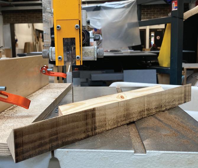 With the limited use of a circular saw which can allow tilted cut, technician Richard helped me create a jig that will enable the material to be temporarily attached to it with double-sided tape.