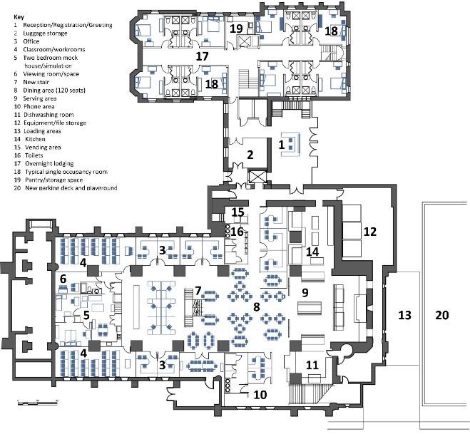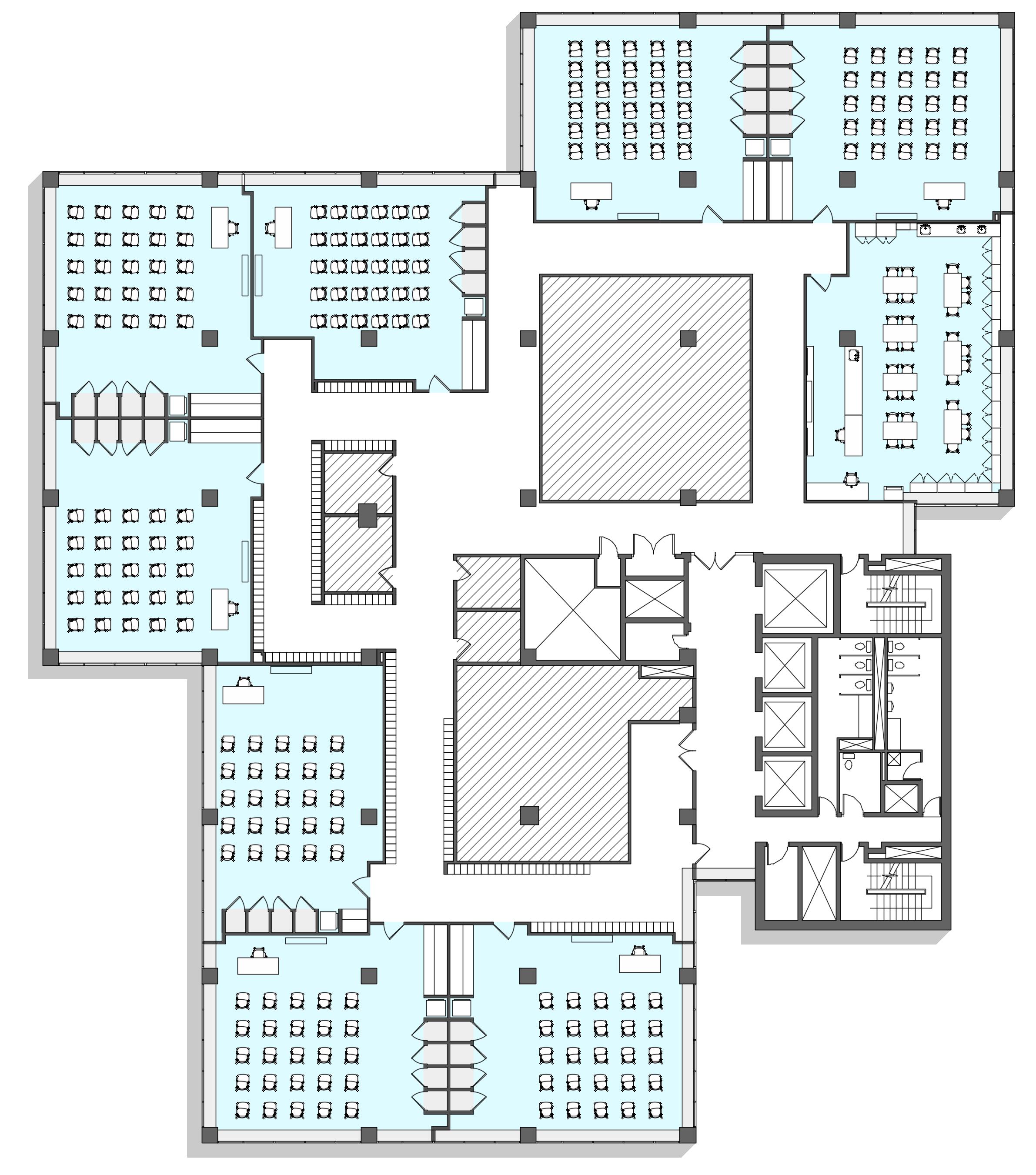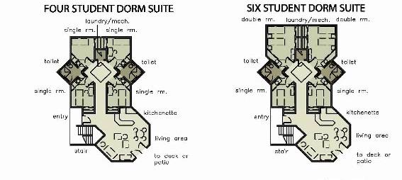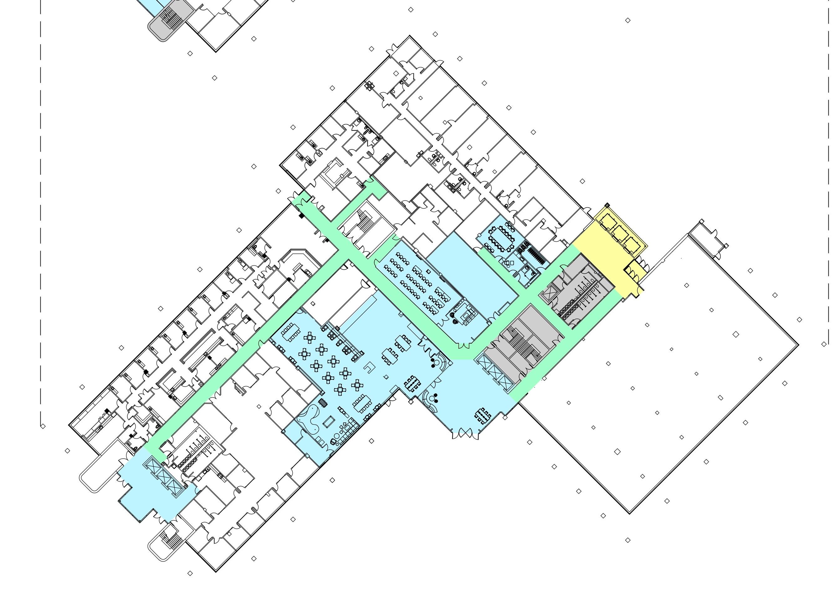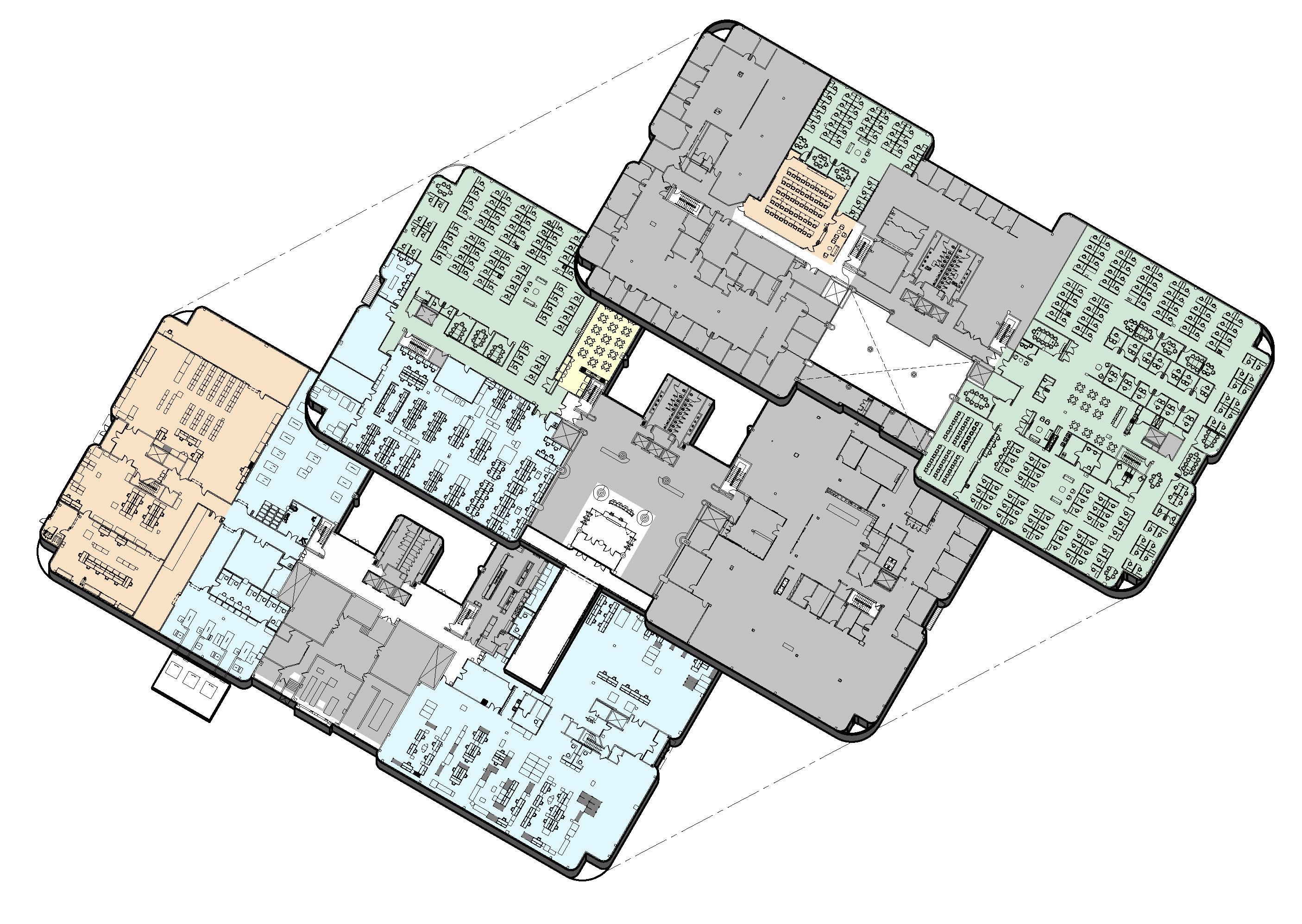 • Alternatively, shared uses like media libraries may be located in multiple locations, clustered within floor groupings. This could also be possible for smaller food service spaces local to floor clusters.