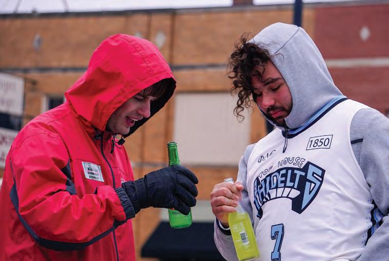 Cole Shifferly ’26 serves in a singles match against Principia College on February 25, 2023, at the Collett Tennis Center. PHOTO BY ELIJAH GREENE ’25 Matthew Brooks ’24 throws the ball out of the ruck against IUPUI at the Wabash College Invitational on March 25, 2023, at Little Giant Stadium. COURTESY OF BRAYDEN GOODNIGHT ’23 Brayden Goodnight ’23 triumphantly raises the Allegheny Rugby Union tournament trophy after beating John Carroll University on April 1, 2023, at Joe Walton Stadium.