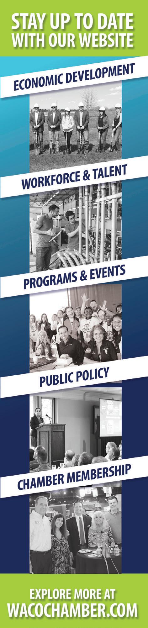 As the Greater Waco region continues to grow, develop, and attract new opportunities, the need for strong policy leadership will only increase. The Chamber is proud to serve as a trusted voice and advocate for the business community. We remain committed to championing policies that ensure our region thrives today and for generations to come. n