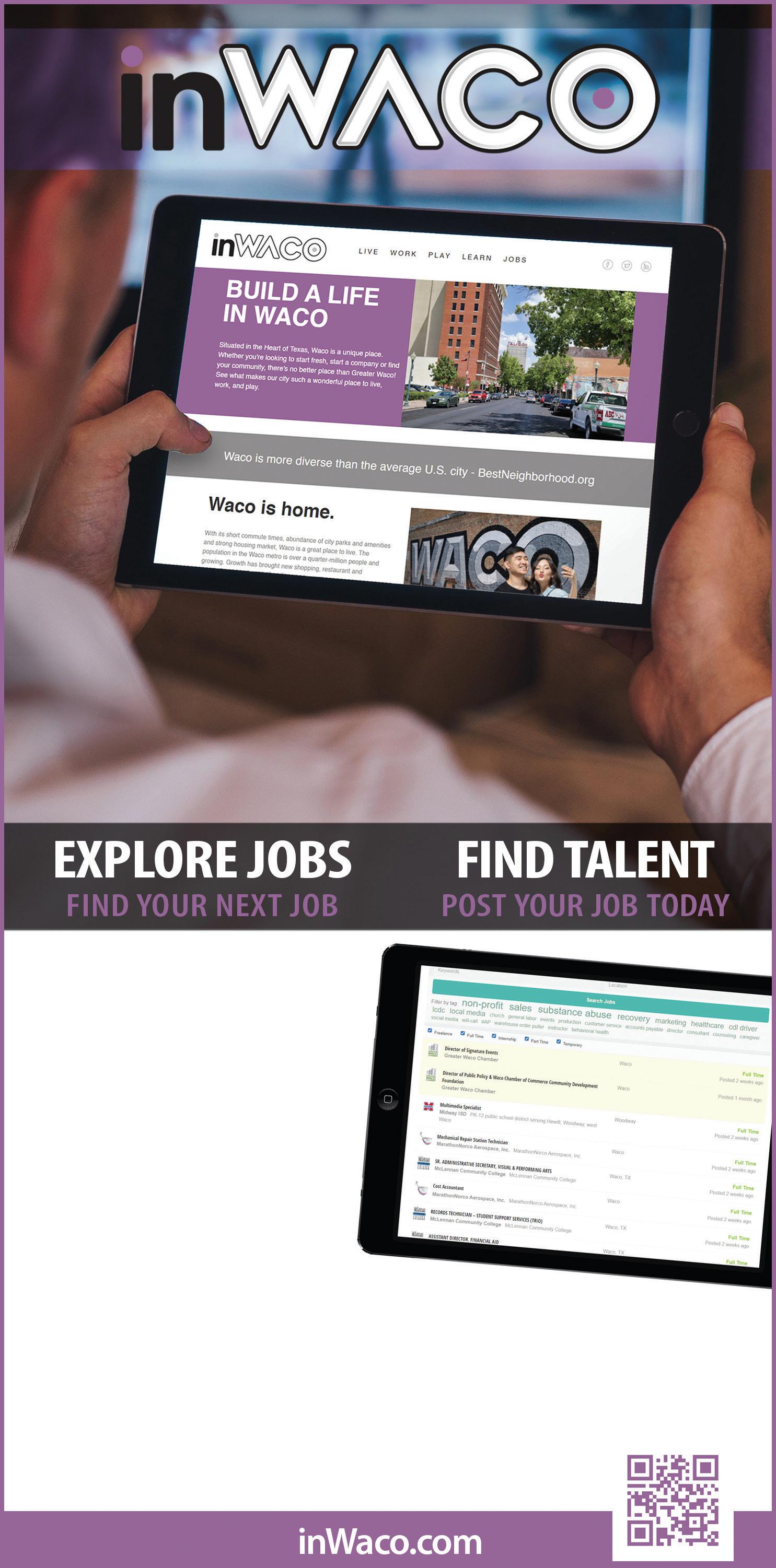 inWaco was created to highlight the characteristics that make our community special with the ultimate goal of recruiting and retaining our most valuable resource: our people. inWaco comprises everything Greater Waco has to offer, including jobs. With an integrated job board and place for job seekers to post their resumes, the inWaco website offers a place for employers and potential employees to connect. Talent and workforce remains vital to the work of your Greater Waco Chamber and we are committed to being part of the solution.
