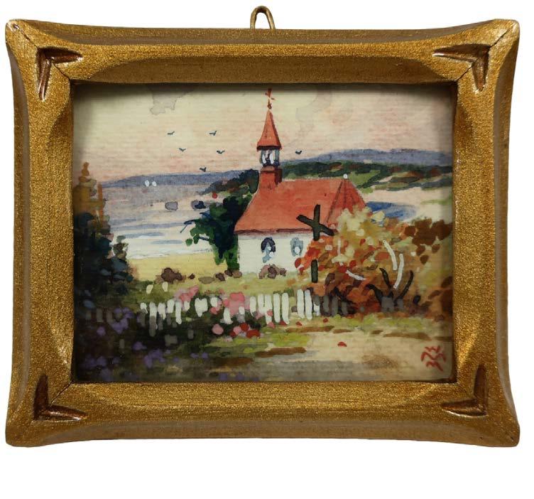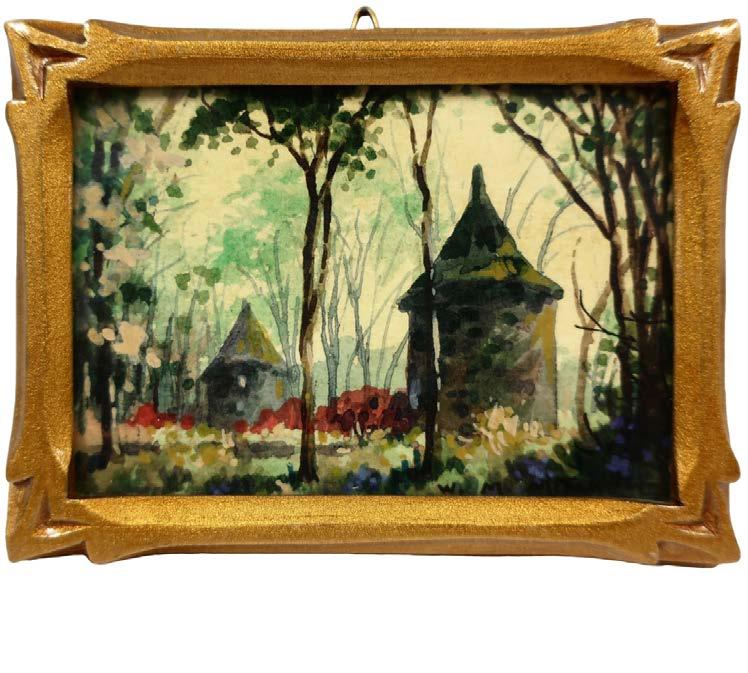 TWO OLD STONE TOWERS, MONTREAL MINIATURE WATERCOLOUR; SIGNED LOWER RIGHT WITH STORY LINE VERSO