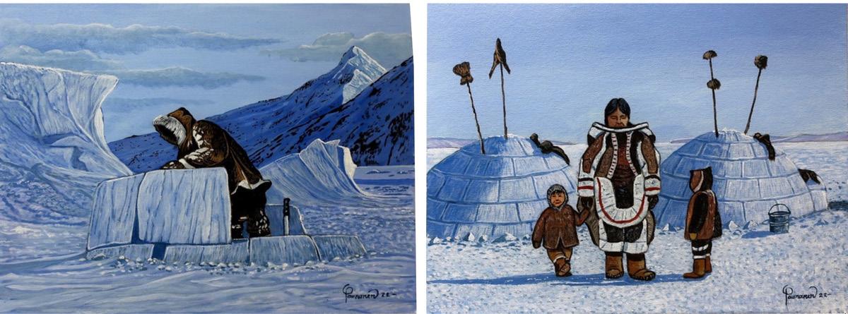 “BUILDING AN IGLOO” & “INUIT FAMILY” TWO ACRYLICS ON CUT CANVAS PANEL; EACH SIGNED AND DATED 22LOWER RIGHT; SIGNED, TITLED AND DATED 2022 VERSO