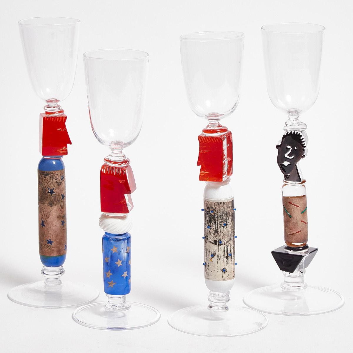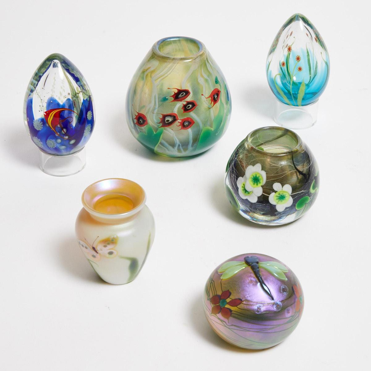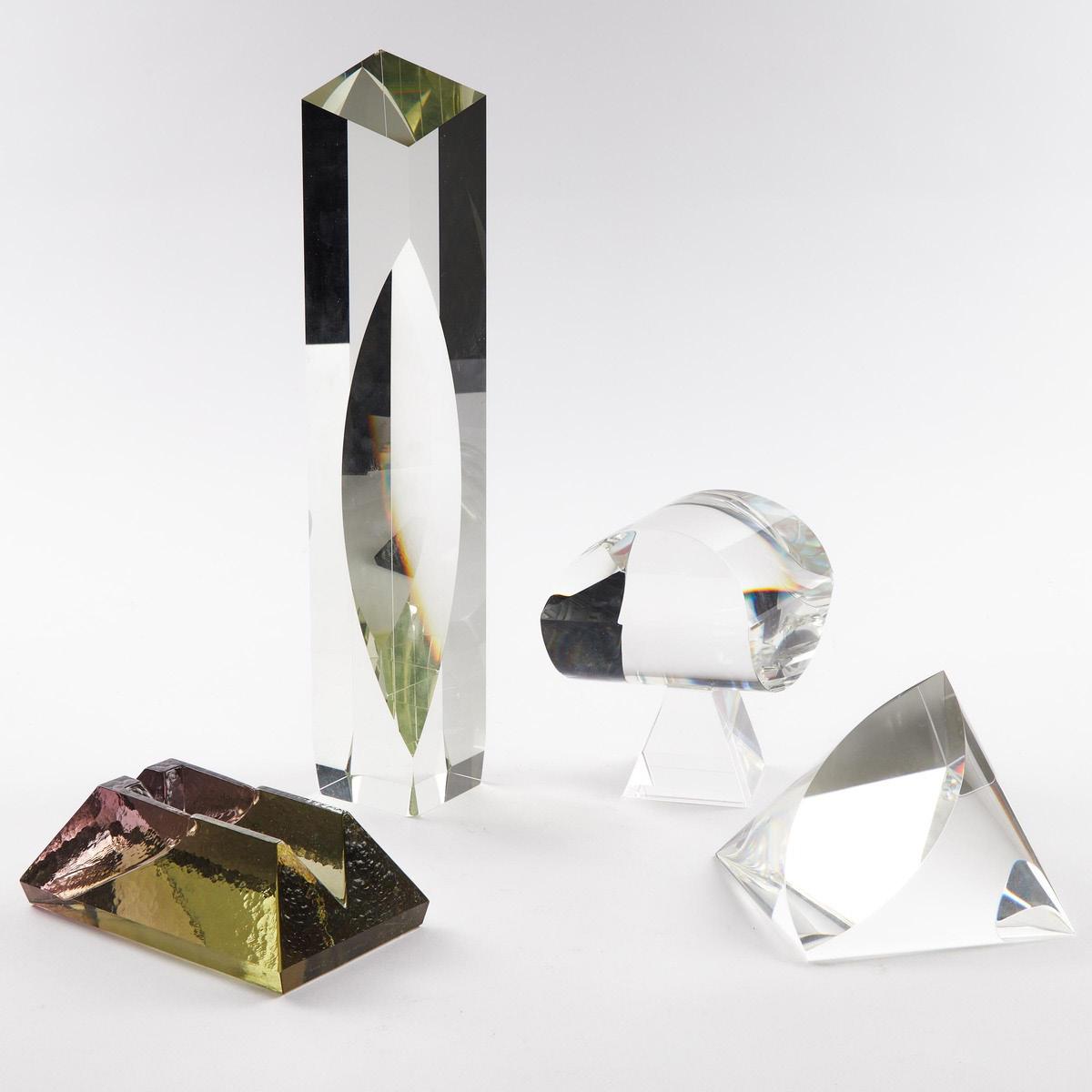 FOUR STUDIO GLASS SCULPTURES AND A VASE, MICHAEL BAYLEN, ANDREW KUNTZ, AND TWO OTHERS, 1980S