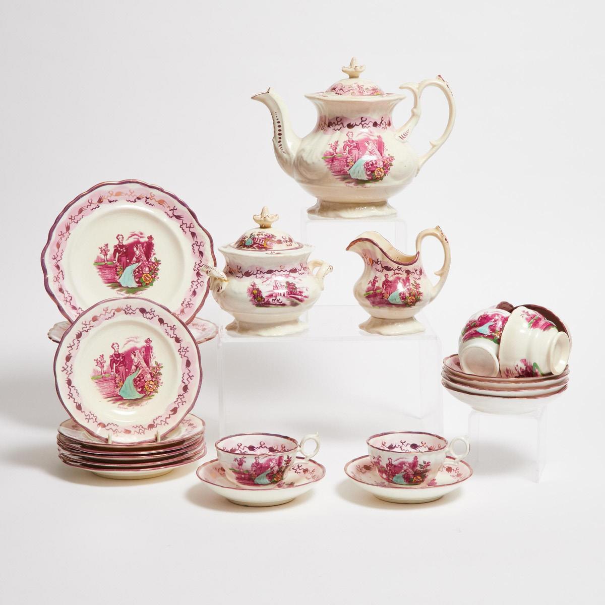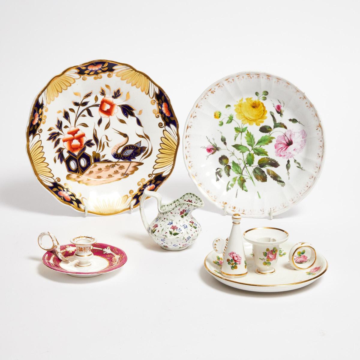 comprising eighteen pieces: coffee pot, cabinet plate, chamberstick, a large and 3 smaller character jugs, 3 cream jugs, 2 tea bowls, small vase, ink bottle, and a cut glass pitcher, coffee pot height 11.6 in — 29.5 cm