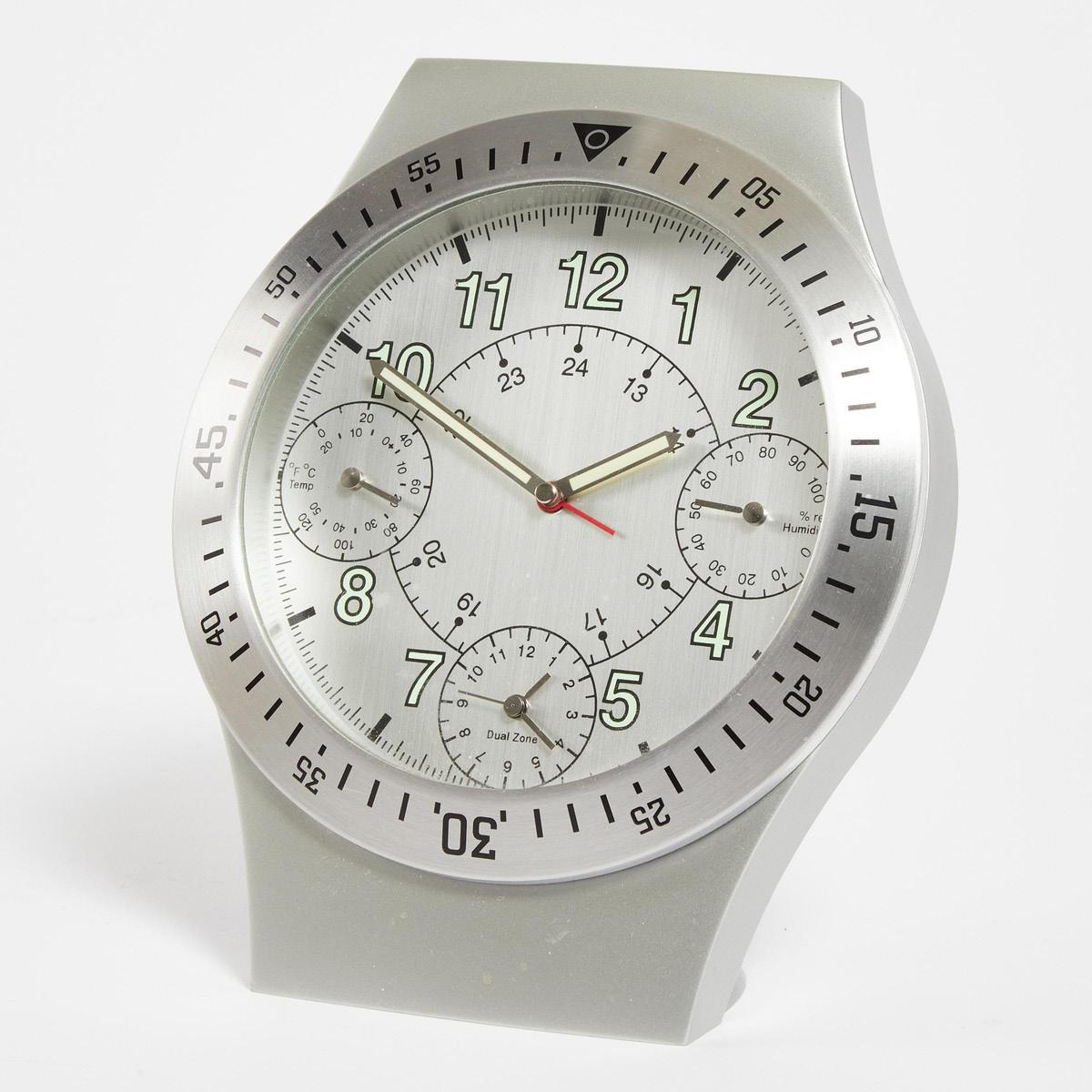battery operated with an alarm and subsidiary dual time zone, hygrometer and thermometer dials, $80 — 120