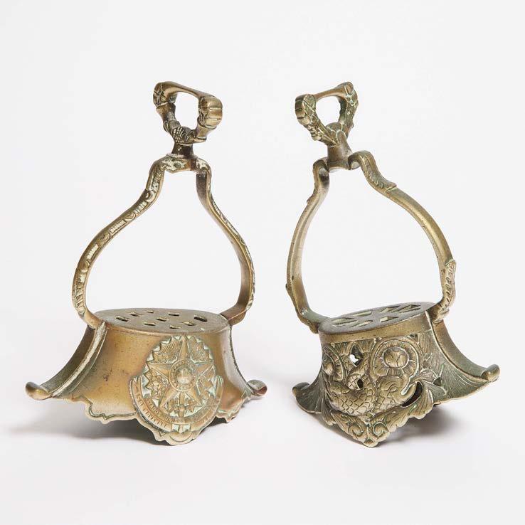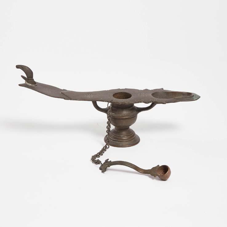 the deep round bowl on a long handle with geometric decoration and a cruciform finial with suspension bale, on later stand, silver height 6.75 in — 17.1 cm; overall height 9.8 in — 24.9 cm