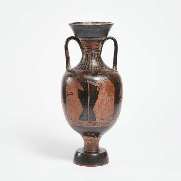 the ovoid body depicting a seated male figure with offerings seated in a naiskos under a winged head of Nike obverse, and the head of a fashionable woman wearing a sakos, reverse, with band of stylized waves under the rim and palmettes overall, the handles flanked by swan’s heads and with masks of Medusa in the volutes, height 19.7 in — 50 cm