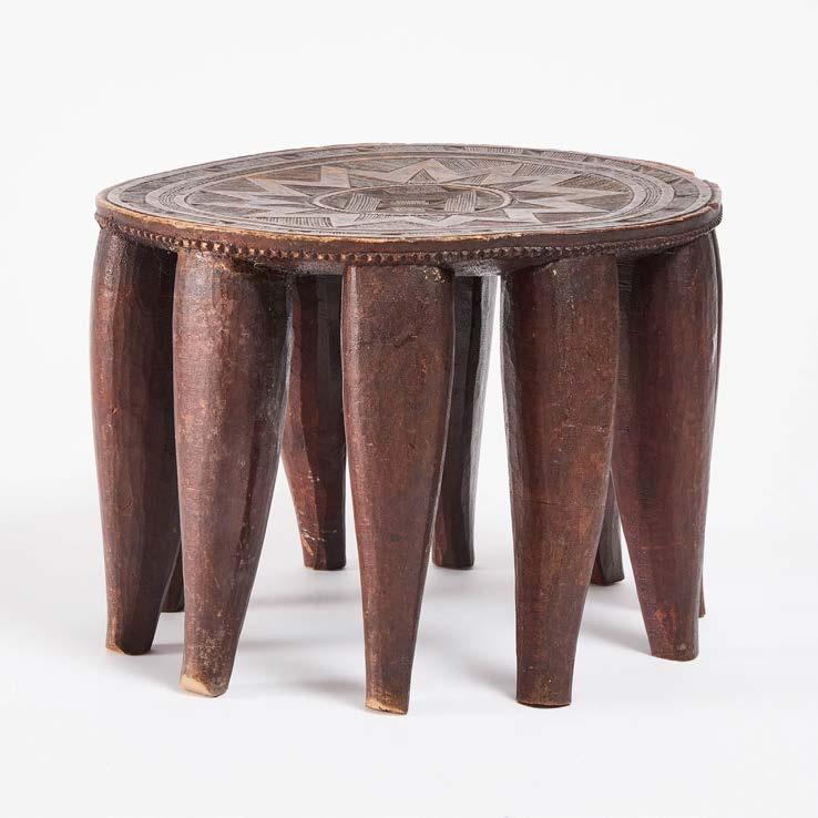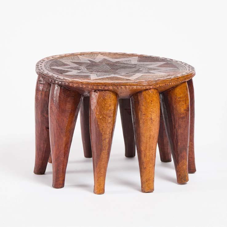 carved wood with 10 legs and incised geometric design to top, height 10.5 in — 26.7 cm, diameter 14.5 in — 36.8 cm