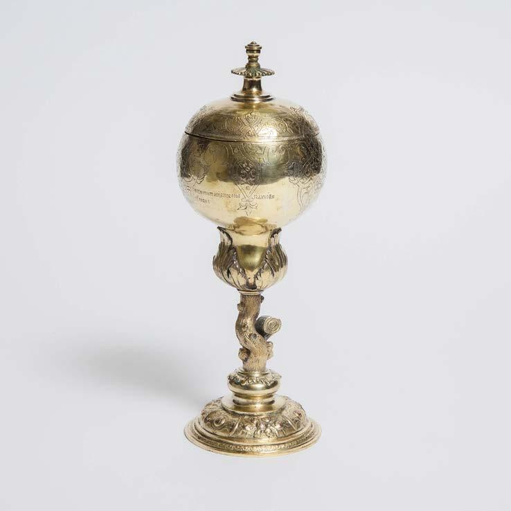 ENGLISH ‘DEPARTMENT OF SCIENCE & ART’ ELECTROTYPE REPLICA OF A 16TH CENTURY CUP AND COVER, ELKINGTON & CO., C.1867 with applied metal labels: Department of Science and Art and Elkington with VR royal cypher, height 12.5 in — 31.8 cm