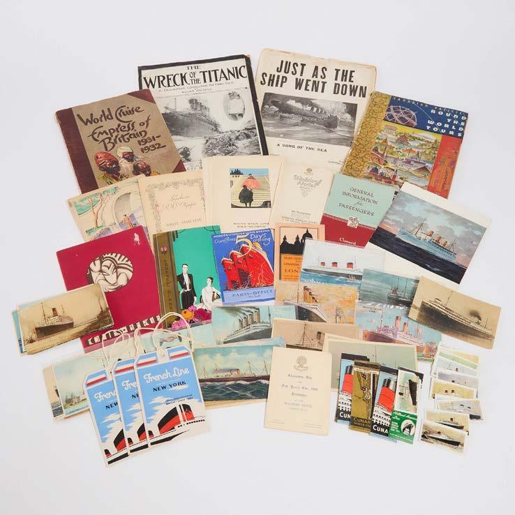 including menus, post cards, pamphlets, match book covers, trading cards, luggage tags, Titanic theme sheet music, etc., sheet music 14 x 10.25 in — 35.6 x 26 cm