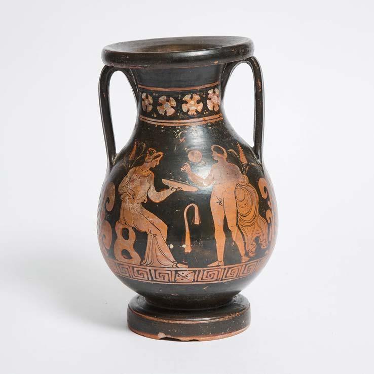 the ovoid body with seated female figure with a phiale, opposing a disrobing male youth with hand mirror on the obverse, and two opposing draped youths, one with staff, on the reverse, all on Greek key band and with palmettes in the surround and a laurel and flower banded neck, height 11.8 in — 30 cm