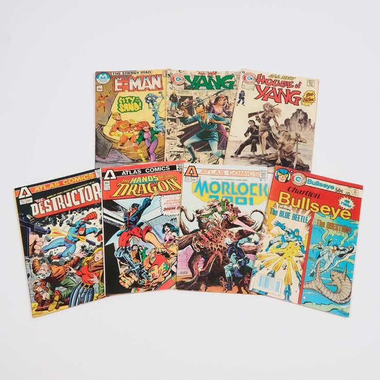 including Atlas Comics Morlock 2001 No.1, Atlas Comics Hands of the Dragon No. 1, Atlas Comics The Destructor No.1, Charlton Comics Charleton Bullseye No.1, Charlton Comics House of Yang No. 1, Charlton Comics Yang No. 9, Charlton Comics All New Yang No. 9, Modern Comics The Energy Man (E-Man) No. 4, largest 10.25 x 6.75 in — 26 x 17.1 cm