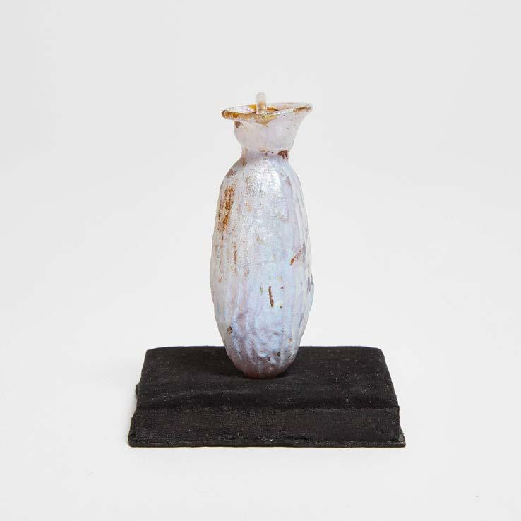 blown into a two part mould, the mouth with in-turned lip, the body with pearlblue iridescence overall, in acrylic case, glass height 3.25 in — 8.3 cm; case height 5 in — 12.7 cm