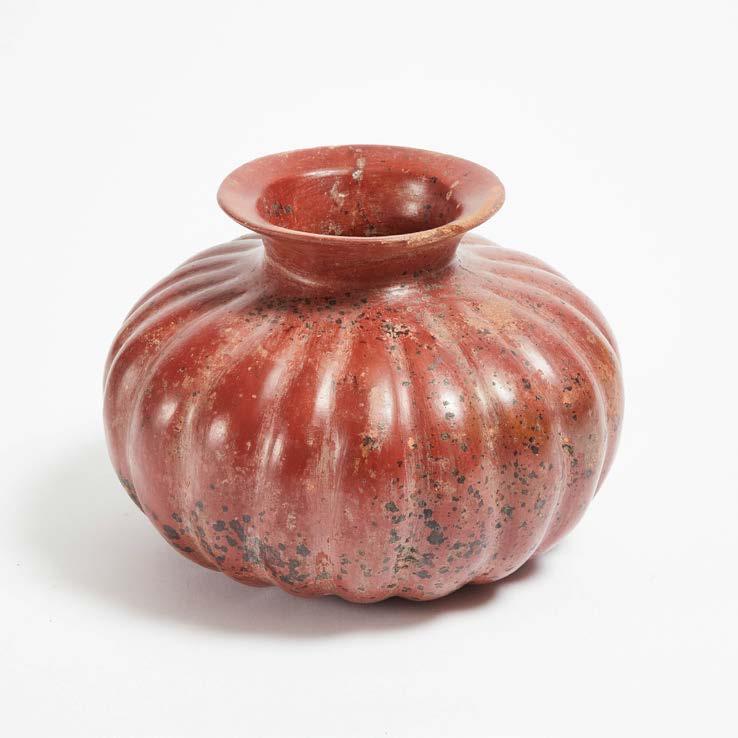 the krater with upturned loop handles, wide everted lip, and banded with painted red and black overall, the unidentified jar with a spreading neck to a flared lip, with black paintedTwo Pieces of Ancient Pottery: A Daunian Olla, 6th/5th century BC, and an Ungent Jar decoration on the shoulder, olla 7.9 x 10.8 in — 20 x 27.5 cm; jar 3.1 x 3 in — 8 x 7.6 cm