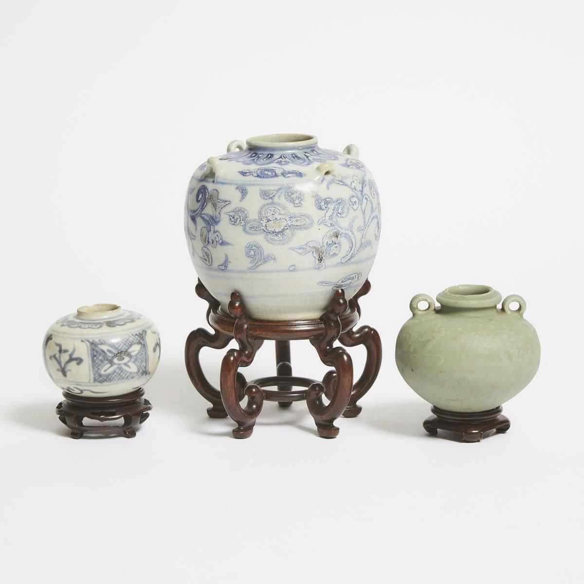 Each of baluster form, the mid-section carved with archaistic motifs, the cover surmounted by a Buddhist lion finial; with hardwood stands