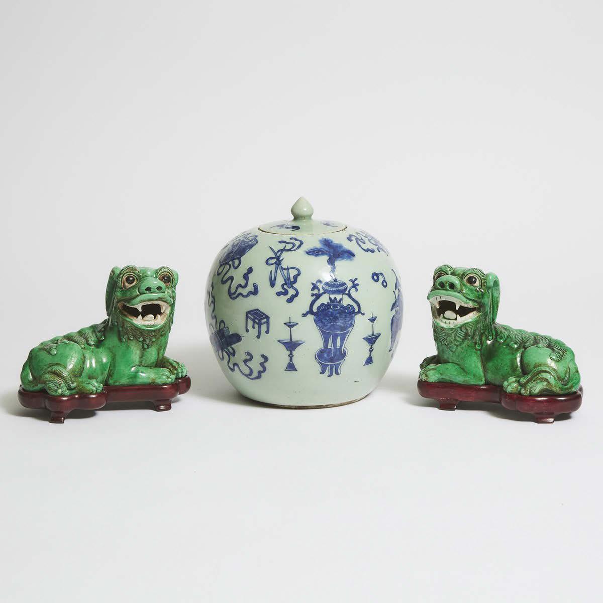 晚清/民国 碧玉雕福狮双耳盖瓶一对