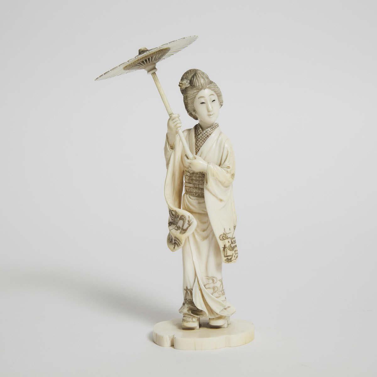 AN IVORY OKIMONO OF A GEISHA HOLDING AN UMBRELLA MEIJI PERIOD -