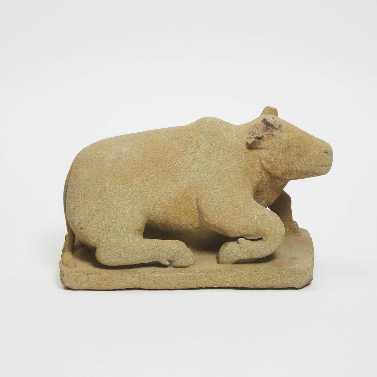 Carved in the round, the buffalo with the legs tucked underneath, the stone of even pale tone