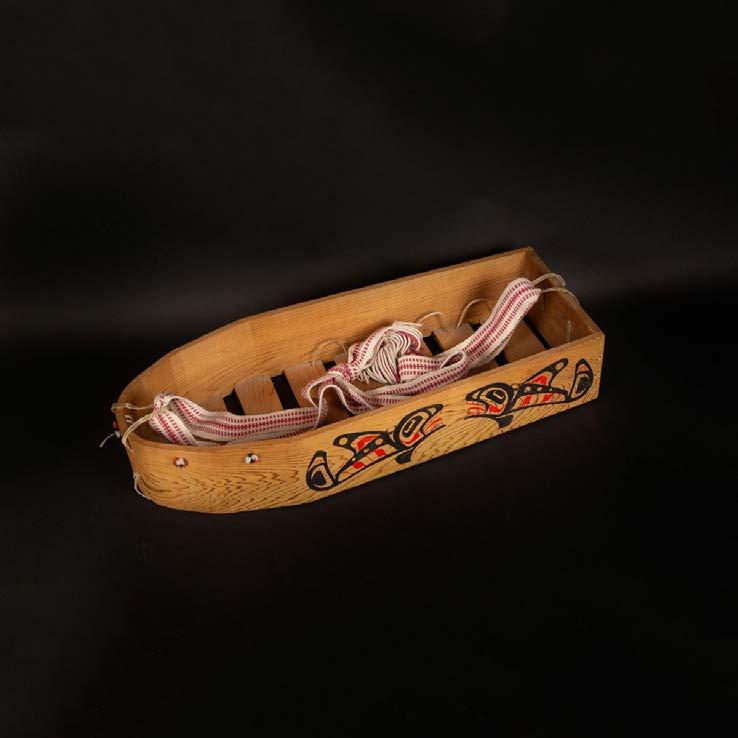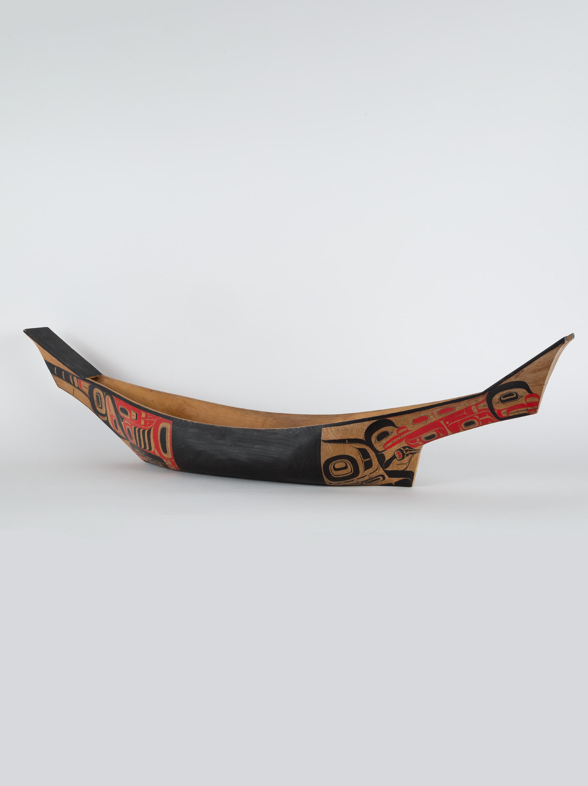 JAY SIMEON (B.1976), HAIDA MODEL CANOE cedar, acrylic paint; monogrammed J.S 99 7.5 x 32.5 x 6.1 in — 19 x 82.5 x 15.5 cm