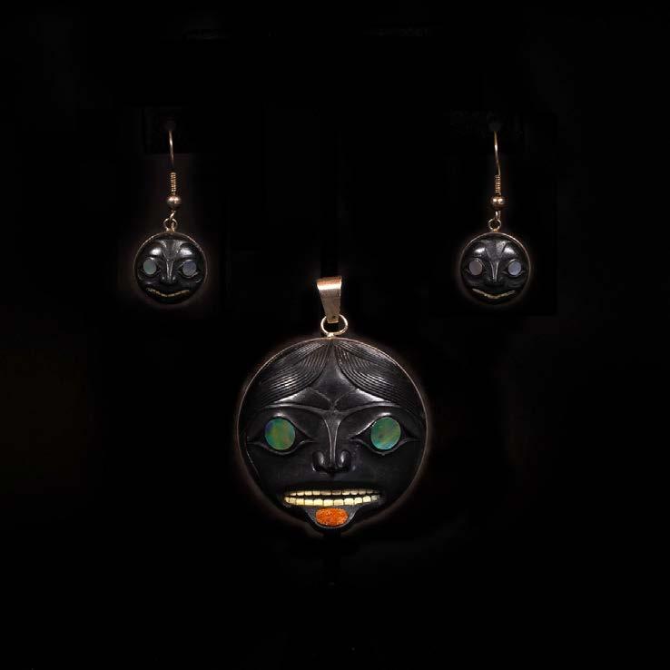 PENDANT AND EARRINGS SET argillite, abalone, catlinite, ivory; signed and dated 04 largest diameter 1.75 in — 4.4 cm;