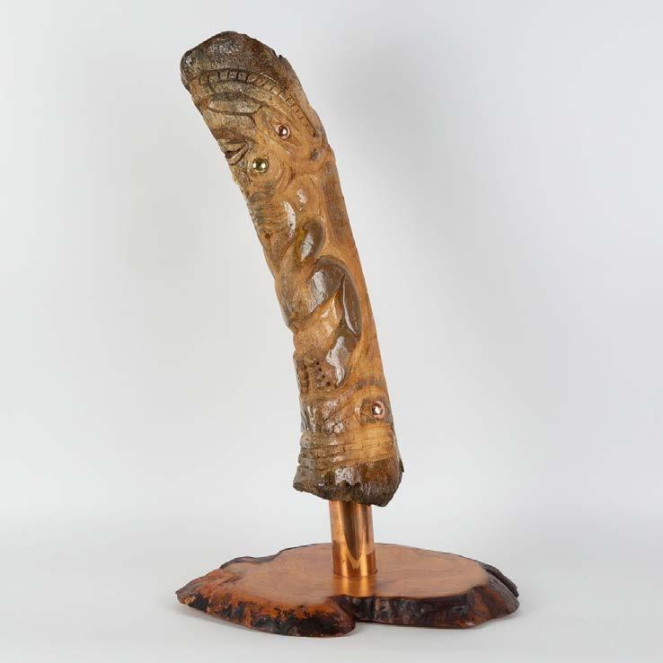 PETRIFIED WHALEBONE CARVING WTIH WHALE SPIRIT AND HUMAN DESIGN petrified whalebone, wood, copper, 26.4lacquerx16.9 x 15 in — 67 x 43 x 38 cm