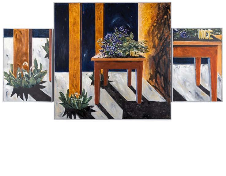 NICE TABLE WITH PRAIRIE GENTIANS AND DETAILS TRIPTYCH oil on signedcanvasanddated 95 lower right; titled overallverso measurements 48 ins x 89 ins; 121.9 cms x 226.1 cms