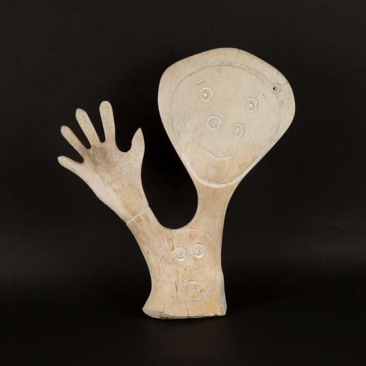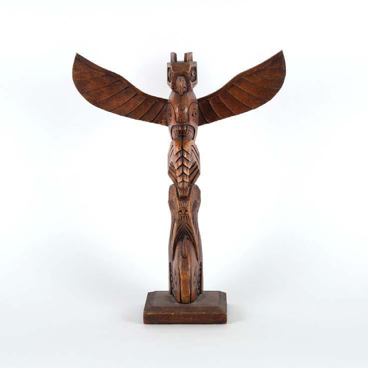 cedar, acrylic paint, cedar bark, feathers; signed and titled verso overall dimensions 22.4 x 12.2 x 7.5 in — 57 x 31 x 19 cm