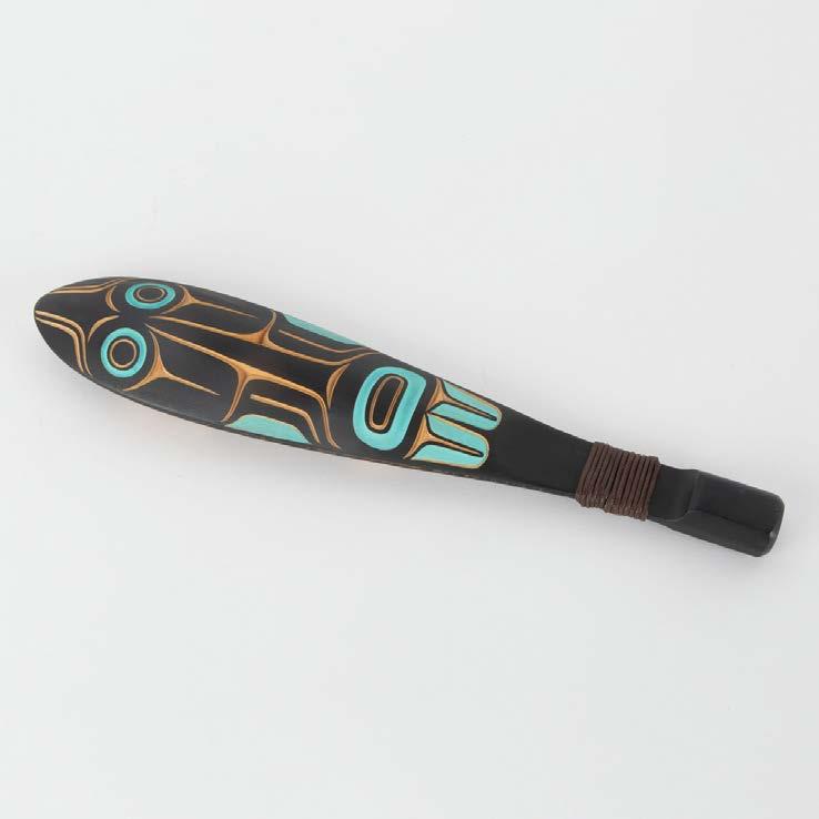 CHILKAT CLAPPER (NOISE MAKER) wood, acrylic paint, leather; signed and dated 2019 14.5 x 3 x .5 in — 36.8 x 7.6 x 1.3 cm