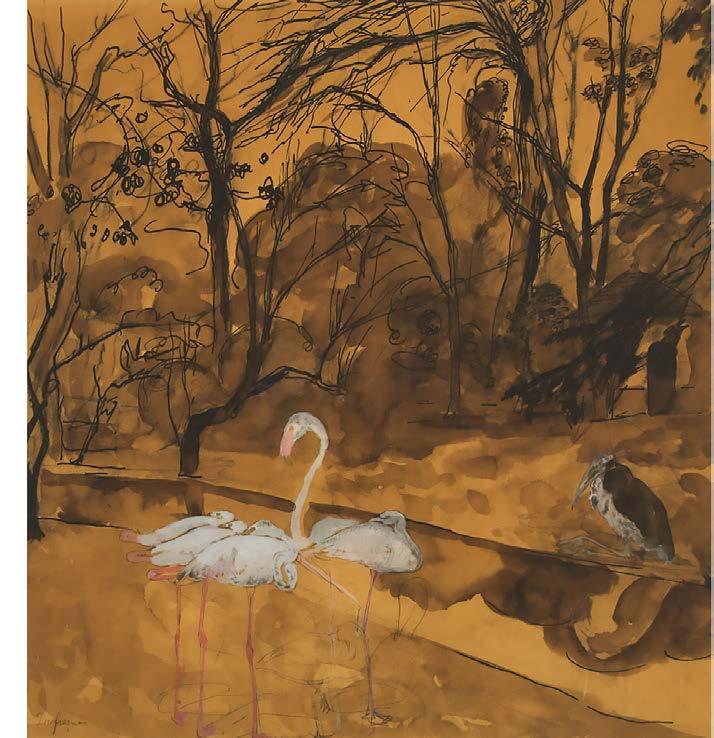 Watercolour, charcoal, gouache and pen and ink on paper; signed lower right. Framed.